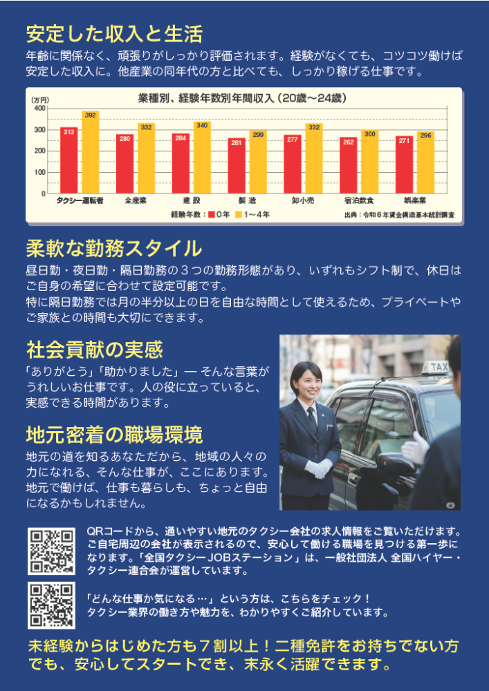 本サイトでは、より多くの方にタクシーの仕事を知っていただくため、3つのターゲット別にタクシードライバーという職業の魅力をまとめたチラシを制作しました。
