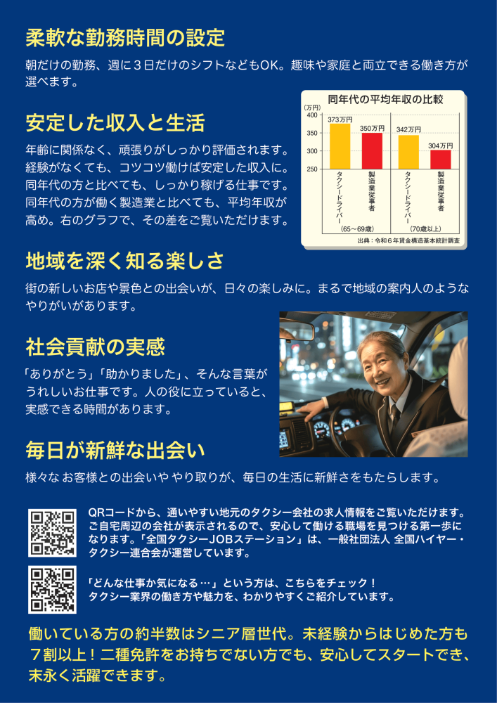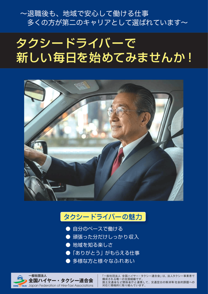 シニア向け: 「タクシードライバーで新しい毎日を始めてみませんか!」を提案。