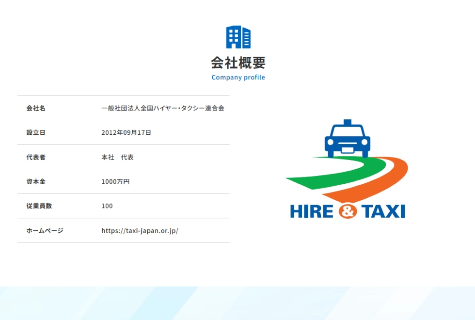 新規事業所登録時にご入力いただいた「会社名・事業所名」「設立」「代表者」「資本金」「従業員数」「ホームページURL」「企業イメージ画像(ロゴなど)」は、求人情報の「会社概要」に掲載されます。